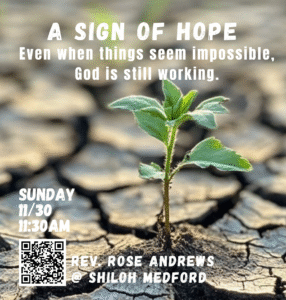 This Sunday at Shiloh, we welcome Rev. Rose Andrews as worship leader and preacher for a message titled “A Sign of Hope.” Drawing from 1 Kings 18:36–46 and John 5:17–25 Rev. Andrews reminds us that even in the space between then and now—between what God has done and what has not yet come to pass—God is still moving, still creating, still designing our future with purpose and love. Like Elijah standing on the mountain, searching the horizon for the faintest cloud, we are invited to trust the God who works behind the scenes, even when the sky looks empty.